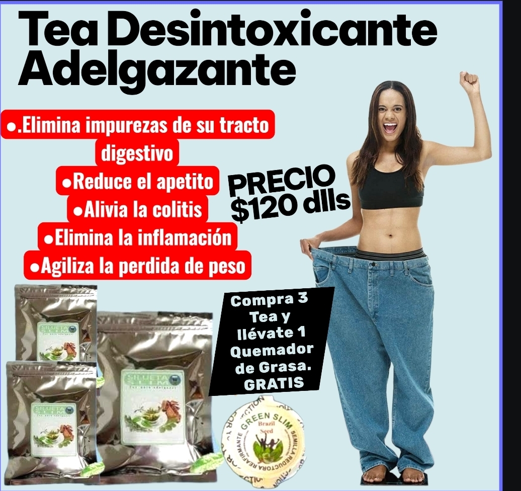 con el Tea Silueta Slim. Elaborado con Hierbas medicinales que le ayudaran a remover, todo lo que su organismo no necesita, con la doble accion de bloquear calorias. usted no sufrira mas de